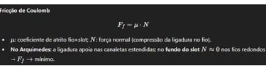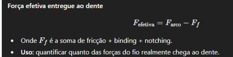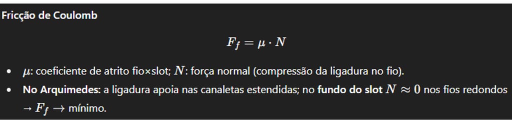 Fricção clássica (µ·N): depende do coeficiente de atrito dos materiais e da força normal fio-slot (aumenta com ligaduras elásticas/amarilhas mais apertadas).