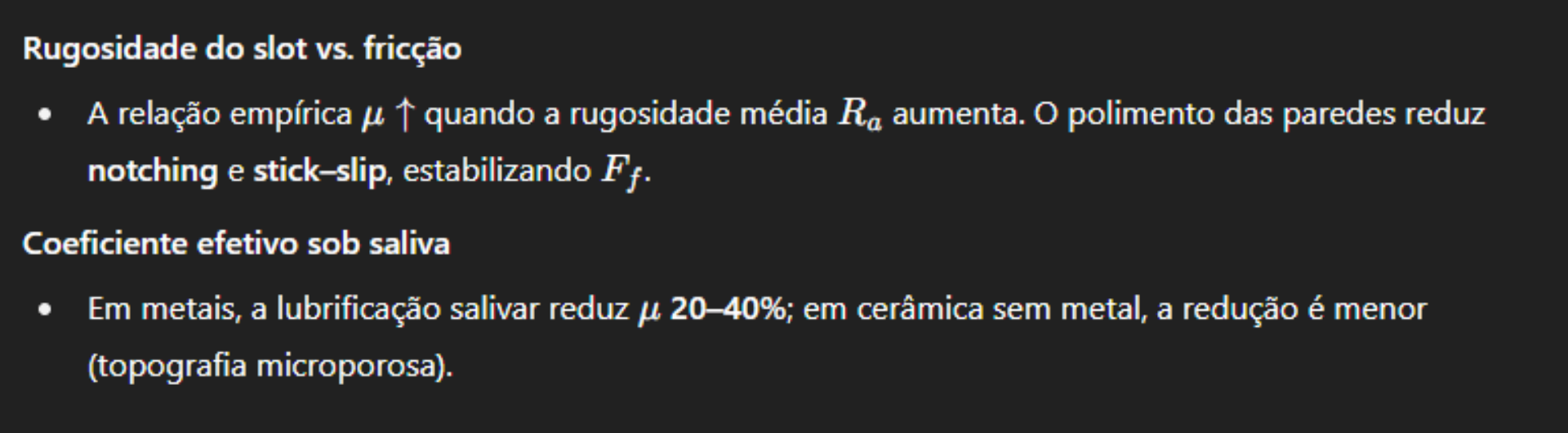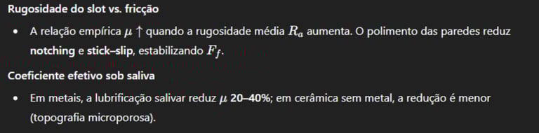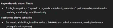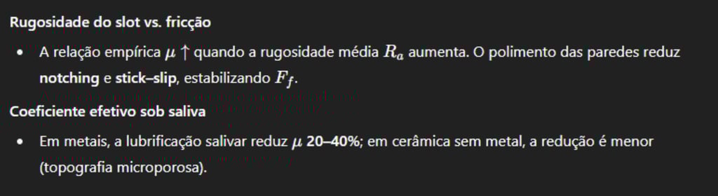 Materiais em contato: cerâmica+fio metálico costuma ↑ fricção; slot metálico em bracket cerâmico reduz isso.