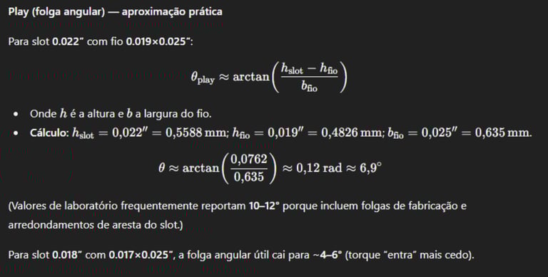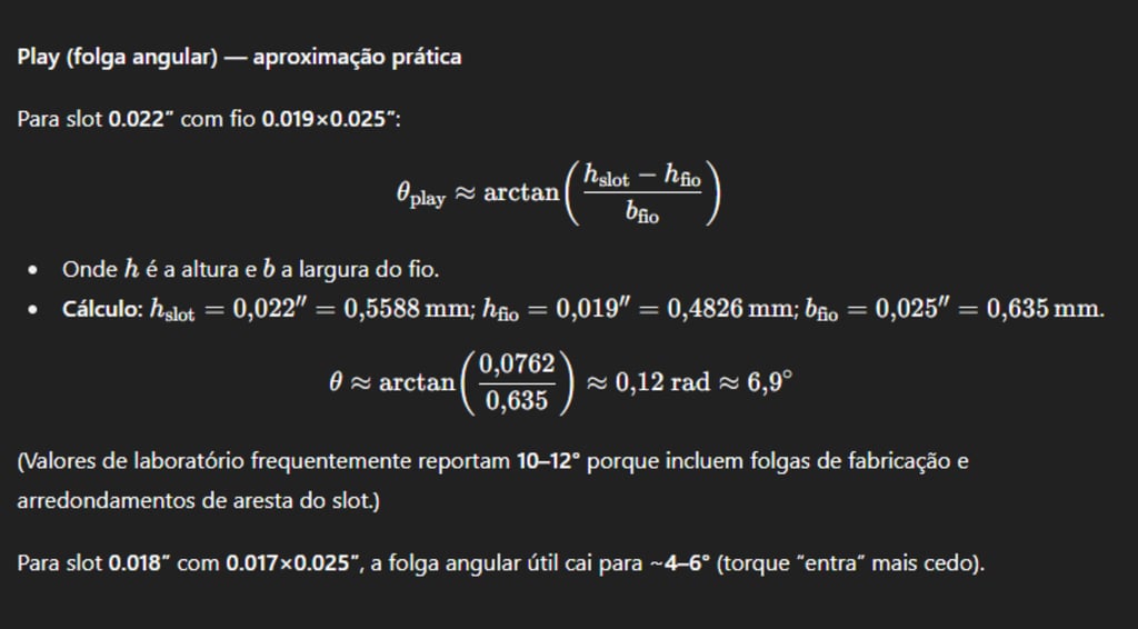 Com slot de 0.018″ e fios de 0.017″×0.025″, a folga cai para ≈5°.