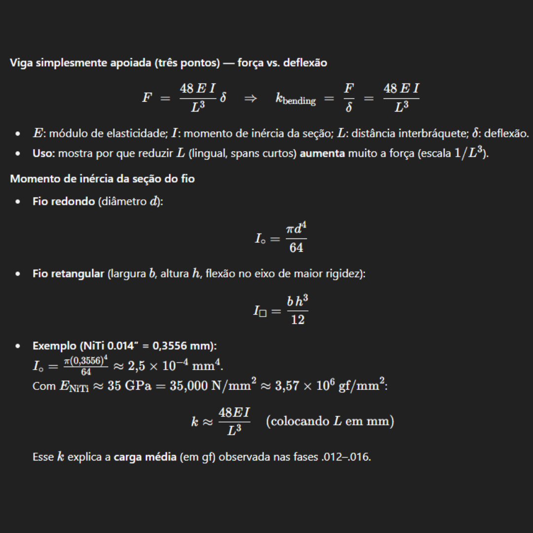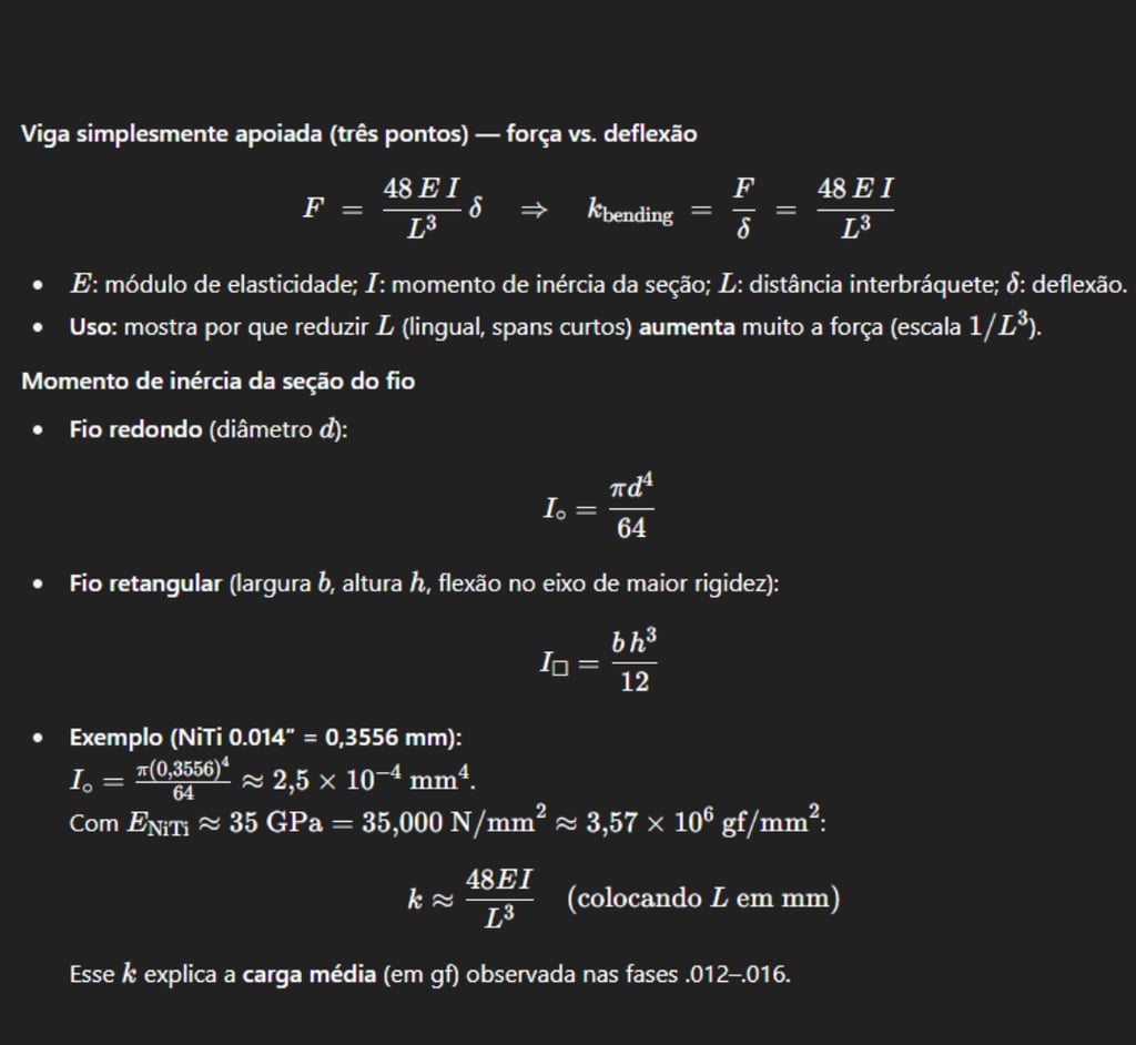 Assim, um pequeno aumento na espessura ou altura do fio gera um aumento significativo na rigidez, devendo ser controlado para não ultrapassar o limite biológico.