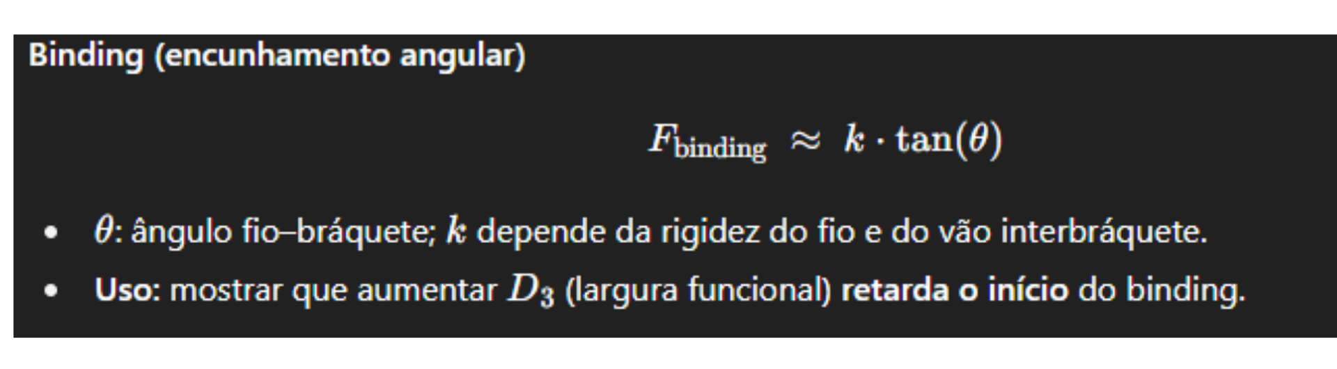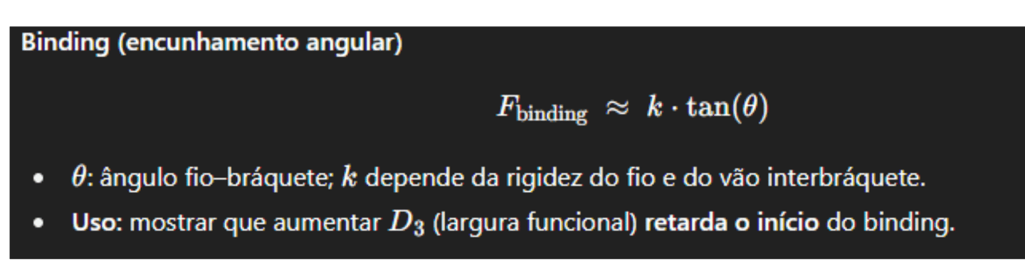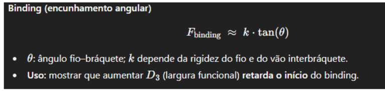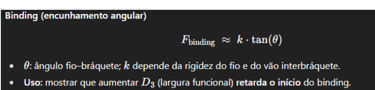 Binding (encunhamento): surge quando o fio toca cantos do slot por angulações entre bracket e fio além de um ângulo crítico (rotinas de espaço/rotação aumentam o binding).