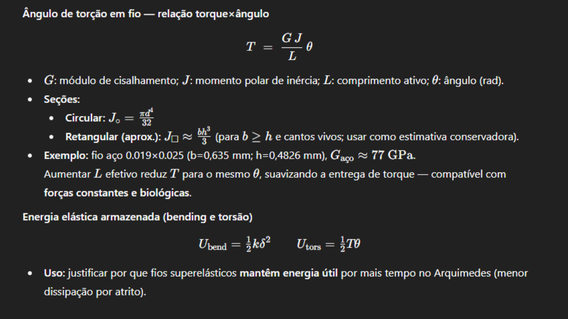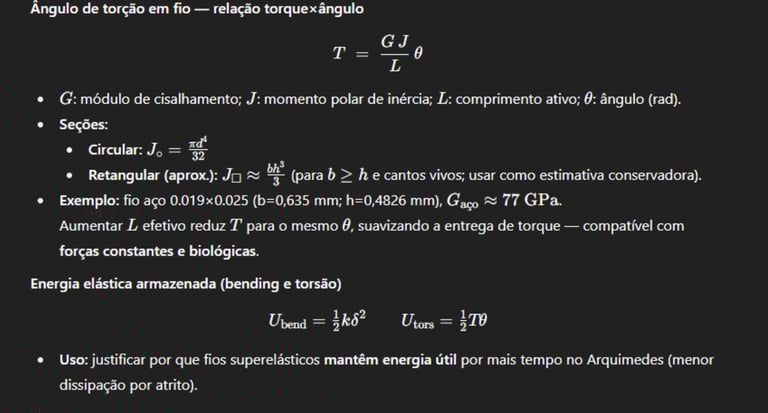 O torque real transmitido (T) depende do módulo de cisalhamento (G), do momento polar de inércia (J) e do comprimento ativo (Lₐ) do fio no slot.