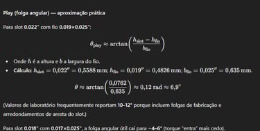 Acabamento superficial e tolerâncias do slot: slots “oversized” (e fios com medidas reais menores que o nominal) aumentam o play e atrasam expressão de torque.