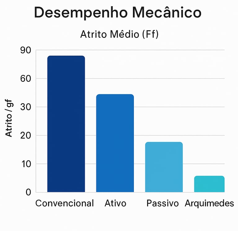 O Arquimedes System conserva 70–75 gf, com torque ≈50% maior e atrito quase nulo.