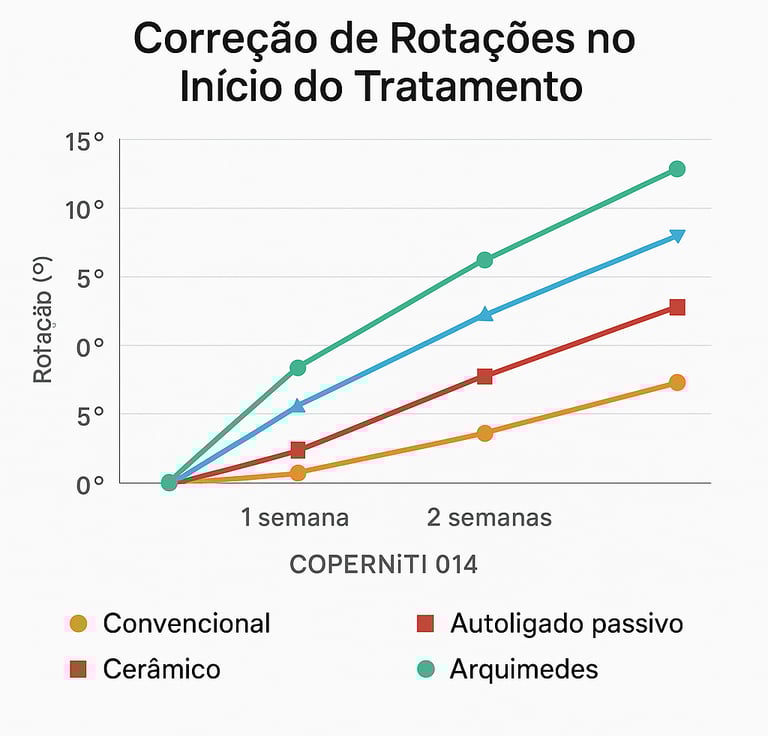 Controle de rotação: pode exigir amarração em “oito”, amarrilhos direcionais ou elásticos de rotação mesmo em autoligados.