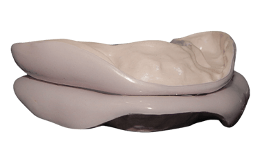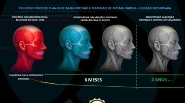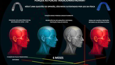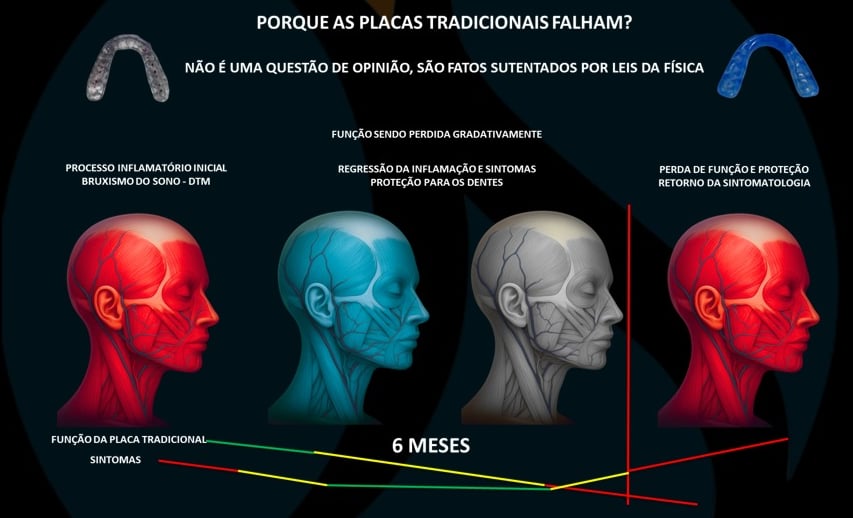 As placas tradicionais (como as placas de Michigan) até saem do consultório lisas, mas em pouquíssimo tempo — dias ou semanas — os dentes já começam a riscá-las e sulcá-las. E basta um sulco para que a função seja perdida. Sem lisura, não há facilitação do movimento. Sem facilitação do movimento, há fadiga muscular, inflamação e dor. Ou seja: o dispositivo continua existindo na boca do paciente, mas já não funciona.